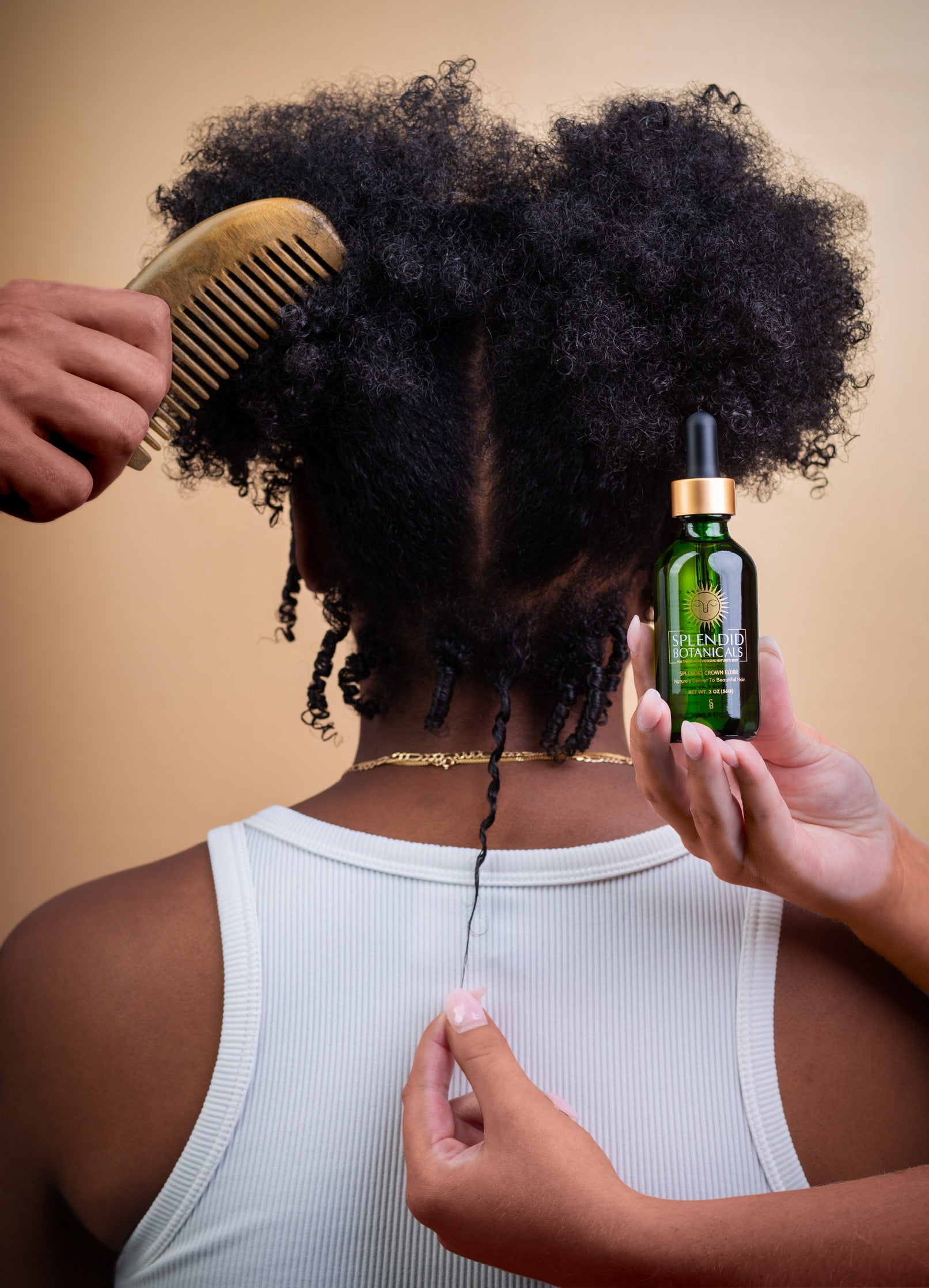Splendid Crown Elixir absorbs with ease, leaving no residue—only nourishment, composure, and presence. It may be used as a daily scalp oil, a length-sealing treatment, or a ritual anointment before protective styling.